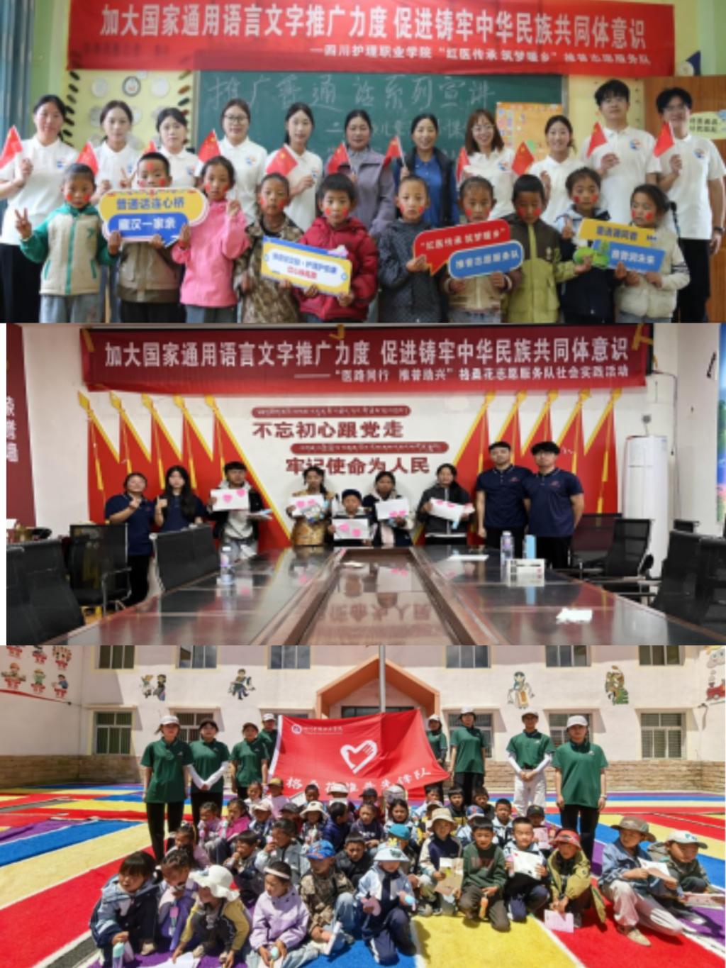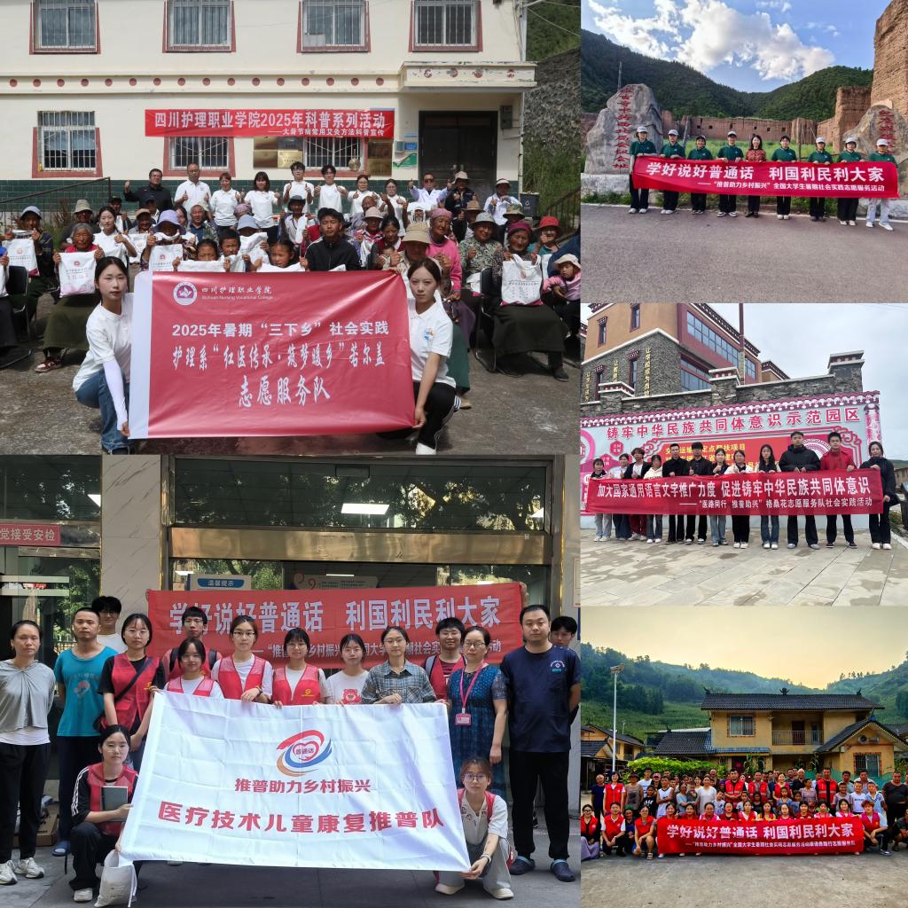 为进一步加大国家通用语言文字推广力度,促进铸牢中华民族共同体意识,引导青年学生为中国式现代化贡献青春力量,暑假期间,学院5支入选教育部“推普助力乡村振兴”全国大学生暑期社会实践活动的志愿服务队,共60余名师生分赴阿坝州若尔盖县、金川县、壤塘县,马边彝族自治县,以及成都、德阳、绵阳、江油等地,将推普课堂延伸至草原牧场、彝乡村寨、康复病房,用普通话搭建健康、产业与文化之桥,把专业知识转化为服务基层的生动实践,有效提升了民族地区和乡村群众的普通话应用能力与健康素养,为乡村振兴注入语言力量。