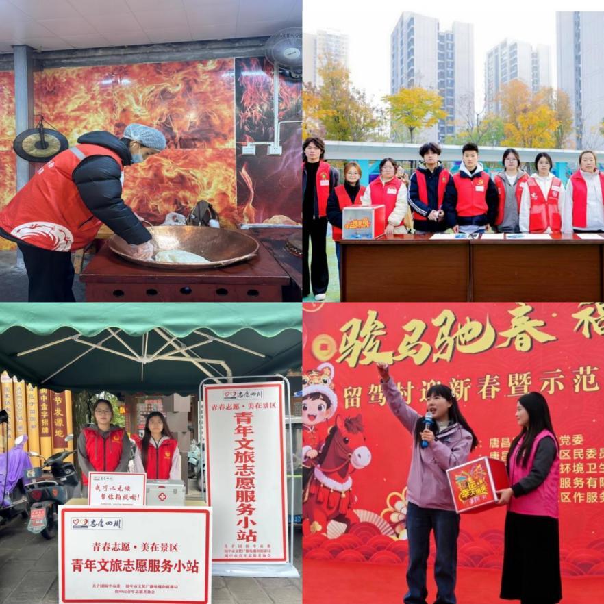 新春佳节之际,川护学子化身文化传播使者,在参与和服务乡村建设中传承优秀传统文化,增进文化认同与自信。在川菜博物馆,学子们担任非遗体验指导,向海内外游客生动展示三大炮、搅搅糖等传统技艺,搭建起文化交流与对话的桥梁;在乡村迎新春活动中,他们全程参与舞台布置、节目协调、游园组织和传统美食区维护,为营造浓浓年味、弘扬民俗文化添砖加瓦;在阆中古城景区,学子们化身景区导览员,在为游客介绍家乡秀美风貌、深厚底蕴的过程中,进一步深化对家乡的归属感与热爱。学子们以实际行动让优秀传统文化在新时代焕发新活力,也让自身的民族文化认同感与自豪感不断增强。